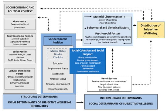 Since social and economic inequalities stem from the discriminative impacts of structural and individual allocation and control of resources to individuals and populations [], examining how these inequalities impact SWB outcomes among elderly populations in SSA is imperative in order to address their needs []. For instance, when the allocation of resources for populations at the household, community and country level is exercised in a manner that neglects elderly populations, it creates disparities in access to economic and social resources and creates long-term inequalities. At the same time, however, individual attributes and life choices simultaneously contribute to disparities in one’s socio-economic position. Together, these factors work to create inequalities to health and wellbeing [,].