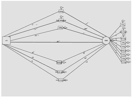 Structural equation modeling (SEM) was used to examine how the link between age and SWB among older adults is moderated by structural and intermediary social factors. SEM was chosen as it provided the ability to analyze structural relationships between measured variables (i.e., observable, measured variables) and latent constructs (i.e., variables that are not directly observed but are rather inferred from other observable variables) as well as estimate the multiple interrelated dependent variables in a single analysis []. Guided by the CSDH, structural factors comprised all socioeconomic variables, the demographic variable ‘marital status’, and the care variable ‘receive government assistance’. Intermediary social factors comprised all of the health care variables, all of the care variables, except ‘receive government assistance’, and the demographic variables ‘residence/location’ and ‘religion’. These multiple potential factors were then tested to examine how they moderate the relationship between age and SWB. Using structural equation modeling provided the total effect, or c path, direct effect and indirect effects of age with wellbeing through each moderator. This method also allows an examination of the extent to which the moderators independently contribute to an explanation of the association of the focal variable with the outcome variable as well as a comparison between moderators.