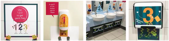 In a review of studies where pictures were used to communicate health information [], it was found that pictures increase awareness of health messages, improve comprehension and are particularly beneficial when literacy skills are low. These aspects are likely important reasons why PSG are effective in communicating handwashing with primary school children. Primary school children (age 4–11) are developing as readers; therefore, images are a pragmatic way to communicate messages. PSG are incorporated into facilities at the point-of-decision (see Figure 1), thereby providing a timely reminder to children. Furthermore, the novelty of integrating facilities and graphics may also help attract children’s attention (particularly when compared to other forms of communication such as posters).