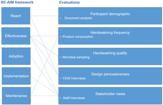 Both quantitative and qualitative research methods are necessary to evaluate health interventions [] because “public health interventions are complex and do not conform to a simple input-output model” []. In this study, five evaluations with diverse methods are employed: participant demographic (document analysis), handwashing frequency (counting product consumption), handwashing quality (counting microbial presence), design persuasiveness (child interview study) and stakeholder views (staff interview study). How the evaluations map onto the RE-AIM framework is illustrated in Figure 2.
