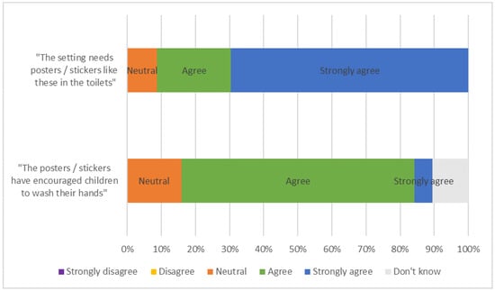 E-bug, Hands Up For Max and Hi Five are multi-component interventions with a heavy lesson plan component that teachers need to deliver [,,]. The PSG in this study are the primary means of communication. This reduces the burden on teachers who are already overstretched []. However, for schools to fully embrace a hand hygiene intervention it should be embedded within the curriculum [,]. “123” PSG could be extended with additional classroom activities or used to supplement other hand hygiene interventions.