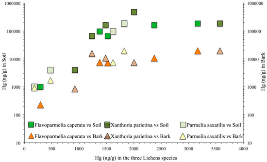 Figure 2. Correlation between Hg contents in lichens, barks, and soils.