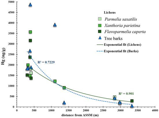Figure 3. Variations of Hg contents in barks and lichens as a function of distance from Abbadia San Salvatore (ASSM) (consistent with [6], the origin was taken at their site a32). For a better graphical comparison, the values for barks were divided by four. At sites where more than one lichen species was present, the fit was calculated considering the average of values.