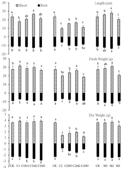The biomass of rape plants with the co-treatment of Mo and Cd (n = 4). Note: Data are the mean ± standard deviation. Different lowercase letters above or below the error bars indicate significant differences (p < 0.05). CK (control group), C1 (treatment by 0.5 mg/kg Cd), C1M1 (treatment by 0.5 mg/kg Cd and 50 mg/kg Mo), C1M2 (treatment by 0.5 mg/kg Cd and 100 mg/kg Mo), C1M3 (treatment by 0.5 mg/kg Cd and 200 mg/kg Mo), C2 (treatment by 6.0 mg/kg Cd), C2M1 (treatment by 6.0 mg/kg Cd and 50 mg/kg Mo), C2M2 (treatment by 6.0 mg/kg Cd and 100 mg/kg Mo), C2M3 (treatment by 6.0 mg/kg Cd and 200 mg/kg Mo), M1 (treatment by 50 mg/kg Mo), M2 (treatment by 100 mg/kg Mo), M3 (treatment by 200 mg/kg Mo).