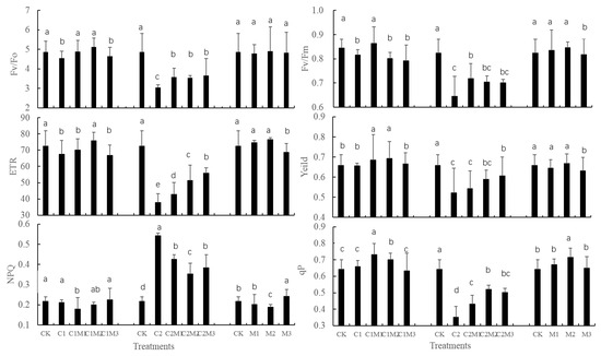 Effect of exogenous Mo on chlorophyll fluorescence parameters in rape plants under different levels of Cd treatments (n = 4). Note: Data are the mean ± standard deviation. Different lowercase letters above the error bars indicate significant differences (p < 0.05). CK (control group), C1 (treatment by 0.5 mg/kg Cd), C1M1 (treatment by 0.5 mg/kg Cd and 50 mg/kg Mo), C1M2 (treatment by 0.5 mg/kg Cd and 100 mg/kg Mo), C1M3 (treatment by 0.5 mg/kg Cd and 200 mg/kg Mo), C2 (treatment by 6.0 mg/kg Cd), C2M1 (treatment by 6.0 mg/kg Cd and 50 mg/kg Mo), C2M2 (treatment by 6.0 mg/kg Cd and 100 mg/kg Mo), C2M3 (treatment by 6.0 mg/kg Cd and 200 mg/kg Mo), M1 (treatment by 50 mg/kg Mo), M2 (treatment by 100 mg/kg Mo), M3 (treatment by 200 mg/kg Mo).