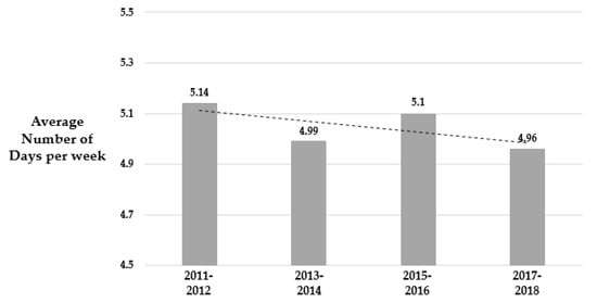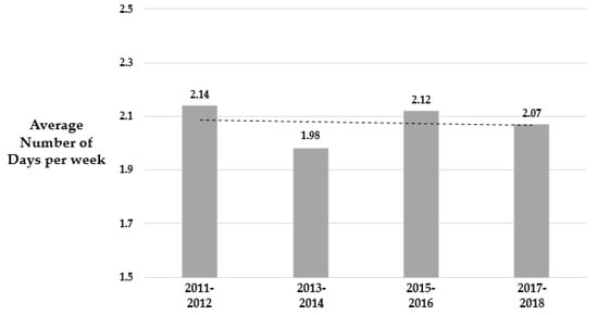 In the trend of physical activity, although there was a slight increase in physical activity in youths aged 11–15 years who met the physical activity guidelines between 2002 and 2010 in 32 European and North American countries, the United States decreased in physical activity []. The National Representative YRBSS of the United States found a decreasing pattern for youth in physical activity from 2003 to 2006 []. Overall, previous studies have shown that youth’s physical activity declined from 2002 to 2010 in the United States. However, our results indicated the trend of overall sample physical activity shows a stable pattern from 2011 to 2017. This result indicates physical activity continued to decline until 2011 but continued steadily until 2017 without any increase or decrease movement in physical activity. In the obese group, the trend of physical activity decreased between 2011 and 2017. This may be due to the fact that adolescents in the obese group have increased TV viewing time. According to a previous study, adolescents who watch more than 2 h of television/video every day are almost twice as likely to be obese compared to their normal-weight peers []. TV watching and media use may reduce the chances of physical activity and encourage the intake of unhealthy food via advertising of fast food shown while viewing [,,].