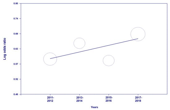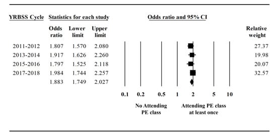 Comprehensive Meta-Analysis (CMA, Biostat Inc., Englewood, NJ, USA) software was used to evaluate the trend in the effect size (association) between participating in physical education and meeting physical activity guidelines. Specifically, we used a meta-regression to examine the trend of the relationship between the observed odd ratio effect sizes and the YRBSS cycles (year) using a random-effects model (under the assumption of between-study heterogeneity). The degree of heterogeneity of the effect sizes was evaluated with the Cochran’s Q-statistic and the proportion of variation attributable to between-study heterogeneity was evaluated with I2 index.