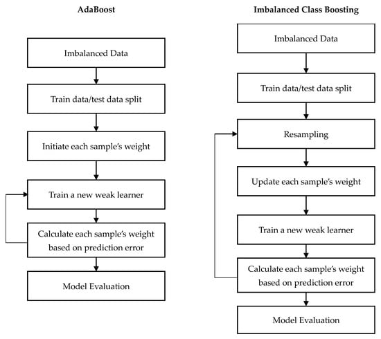 The first imbalanced class boosting algorithm SMOTEBoost was proposed by Chawla et al. []. It combines the SMOTE and the standard boosting procedure. The standard boosting procedure gives equal weights to all misclassified examples, and sampling distributions in subsequent boosting iterations could have a larger composition of majority class cases. By introducing SMOTE in each round of boosting, SMOTEBoost algorithm gradually increases the number of minority class samples. The algorithm procedure of AdaBoost and imbalanced class boosting are shown in Figure 2. Seiffert et al. [] proposed the RUSBoost algorithm that combines RUS and AdaBoost. In each iteration of boosting, RUS is used to balance class instead of SMOTE. CUSBoost [] is another imbalanced class boosting algorithm that combines under-sampling with AdaBoost. CUSBoost clusters majority class first, and then randomly removes majority samples based on their cluster.