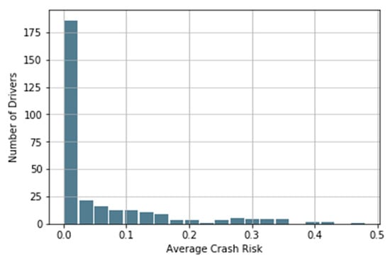 Using the NGSIM trajectory data of 299 LVPs, we can calculate the Average Crash Risk (ACR) for each following vehicle in LVPs. ACR reflects the driver’s aggressiveness in the car-following process. Figure 3 shows the histogram of Average Crash Risk for all 299 drivers. In total, 35.7% of drivers have an ACR = 0, which means these drivers never have negative DSS value and always have enough time to avoid a collision, and 65.8% of drivers have an ACR < 0.1, which indicates only occasional and temporary crash risk during the car-following process.