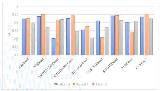 Figure 4 shows the AUPRC values each algorithm achieved in Dataset 3–5. We find that SMOTEBoost and CUSBoost are robust with a highly imbalanced dataset. SMOTEBoost and CUSBoost have AUPRC higher than 0.9 in all three datasets. When imbalance ratio increases from 6:1 (Dataset 3) to 14:1 (Dataset 5), AdaBoost and XGBoost’s AUPRC declines significantly, even with resampling. SMOTE + AdaBoost and RUSBoost can get better AUPRC when imbalance ratio increases; however, their performance is not stable. SMOTE + AdaBoost has the lowest AUPRC among all algorithms in Dataset 3. RUSBoost has the second-lowest AUPRC in Dataset 4.