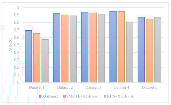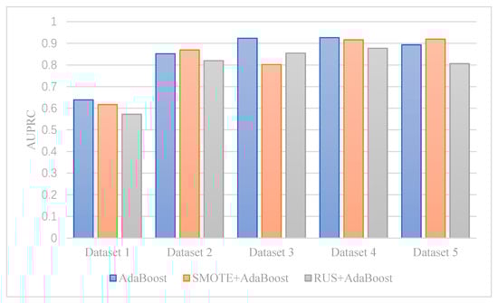 We compare the difference of AUPRC between cost-sensitive boosting without resampling and standard boosting with resampling in Figure 5 and Figure 6. By balancing the majority class and the minority class in the train data with resampling, we expect that AdaBoost and XGBoost can be fitted to predict aggressive drivers better and then have a higher AUPRC. However, the result is not consistent. On one hand, using Random Under Sampling almost always pushes down AUPRC, compared to cost-sensitive learning. On the other hand, using SMOTE resampling slightly raises AdaBoost’s AUPRC in Dataset 2 and Dataset 5, but reduces AdaBoost’s AUPRC in Dataset 1, 3, and 4. In all datasets, it is better to train cost-sensitive XGBoost model directly without using any resampling techniques. Shown in Figure 5, SMOTE + XGBoost and RUS + XGBoost’s AUPRC are always lower than XGBoost’s.
