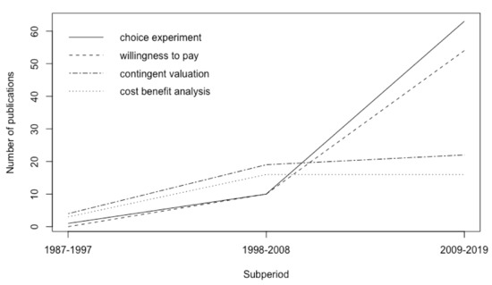 The relevance of choice experiments as a prominent keyword used by researchers has increased over time. We show the evolution of four keyword categories through 3 equally spaced subperiods: 1987–1997, 1998–2008 and 2009–2019 (Figure 3). The first two subperiods were dominated by keywords associated with contingent valuation methods (with labels “contingent valuation” and “contingent valuation method”) and cost-benefit analysis. However, a sudden change was found in the trend during the subperiod 2009–2019. During this time the choice experiments (with labels “choice experiment”, “choice experiments” and “choice experiment model”) dominated the researchers’ interest, closely followed by the willingness to pay keyword.