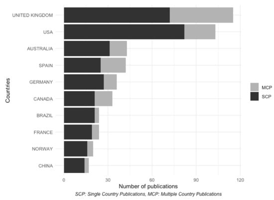 Lastly, there is another interesting point related to the authors’ affiliation country; Figure 6 separates the papers whose authors’ affiliations are all located at the same country (Single Country Publications, SCP) and those with authors’ affiliations from different countries (Multiple Country Publications, MCP). The UK and the USA dominate the research on environmental valuation according to the number of papers published during the analyzed period. There are only 5 European countries in the top 10, while China is the only Asian representative. China is also in the last position in the top 10. Regarding the collaboration between authors from different countries, researchers from the UK and Spain are the most likely to collaborate in multinational publications, while Brazilian and Chinese affiliations produced the fewest publications with contributions from foreign authors.