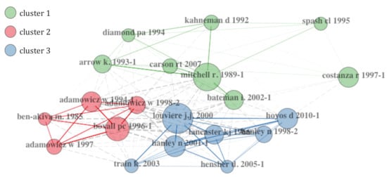 This subsection begins with some comments about what productivity is in the field of research publication. Of course this is a wide field of debate, but some preliminaries must be established before proceeding with the co-citation analysis. According to [29], there are several measures to account for productivity. The most basic bibliometric measure is the number of papers published, which provides the raw data for all citation analysis. Another measure is the number of citations, which determines the recognition and influence of a paper. Then we can distinguish between citations received from papers published in Journals indexed in WoS, or citations received for other Journals not considered in WoS. As stated by [29], a measure of association between highly cited papers is used to form clusters: “That measure is the number of times pairs of papers have been co-cited, that is, the number of later papers that have cited both of them”. Hence, co-citation implies that two papers are cited in a third paper and assumes that both papers are related. We have performed a co-citation analysis by differentiating 3 main clusters in different colours (Figure 7). The references of cluster 1 are represented by the book by Mitchell and Carson [30], in which the authors describe the contingent valuation method and claim that “the contingent valuation (CV) method offers the most promising approach for determining public willingness to pay for many public goods”. However, the positivist perspective in Mitchell and Carson [30] is contested by other prominent works in the same group. The report in Arrow et al. [31] indicate several drawbacks to the contingent valuation method and gives some guidelines to be used if the proposal is to produce useful information for natural resource damage assessment. The research in Kahneman and Knetsch [32] reports the most serious shortcoming of the CV method. According to these authors: “the assessed value of a public good is demonstrably arbitrary, because willingness to pay for the same good can vary over a wide range depending on whether the good is assessed on its own or embedded as part of a more inclusive package”. There is a more recent relevant book in this group, Bateman et al. [33], which gives a general approach to stated preferences techniques with application to different non-market goods and services.