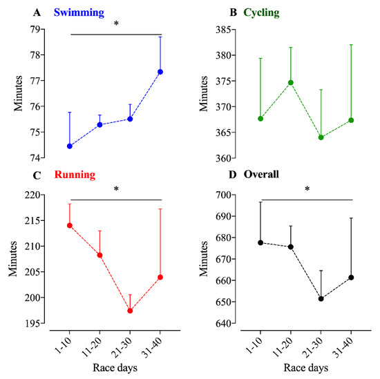 Ten-day average times of swimming, cycling, running, and overall time in 40 Ironman-distance triathlons. *: statistical significance (p < 0.05) for time-effect. (A): Swimming time; (B): Cycling time; (C): Running time; (D): Overall time.