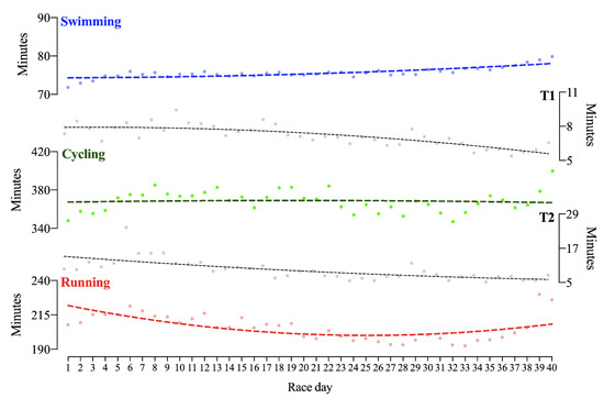 In summary, a fast running performance is significantly influenced by a low body weight, a fast cycling performance is significantly influenced by both a low wind speed and by the previous day’s effort, and a fast overall performance is significantly influenced by both fast running and fast cycling performances. This study could be of assistance for coaches and athletes preparing for similar challenges. More in-depth physiological responses (i.e., body composition measures, sleep quality, inflammation, oxidative stress) to such a challenge with or without a follow-up could be the next step. A highly trained professional triathlete with extensive previous experience is able to finish daily an Ironman-distance triathlon on consecutive 40 days where cycling and running performance are highly predictive of overall time.