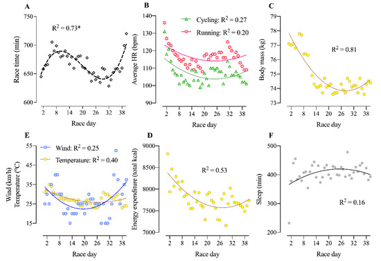 Non-linear regression for overall performance, weather and physiological variables in 40 Ironman-distance triathlons in 40 days. *: third-order polynomial fit; all other regressions were second-order polynomial fits. (A): overall performance; (B): average heart rate (HR) during cycling and running; (C): body mass; (D): wind speed and average temperature; (E): energy expenditure; (F): sleep minutes between race days.
