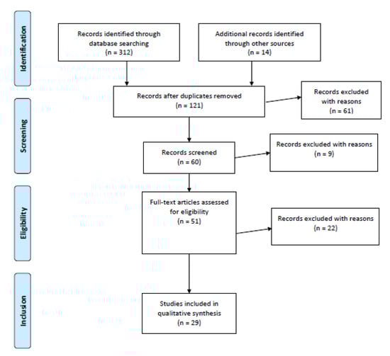 In order to obtain a high standard of reporting, we adopted the ‘Preferred Reporting Items for Systematic Reviews and Meta-Analyses’ (PRISMA) guidelines []. PRISMA may be considered an evidence-based minimum set of items that is frequently used in both systematic reviews and meta-analyses. PRISMA usually allows the reporting of reviews assessing randomized clinical trials, but it may be similarly adopted for reporting systematic reviews of other research, such as reports referring to evaluations of interventions. The PRISMA statement includes a 27-item checklist and a four-phase flow diagram for reporting in systematic reviews and meta-analyses. PRISMA is usually adopted to include a reliable report of different types of health studies and it mainly aims to improve the quality of research used in decision-making in healthcare.