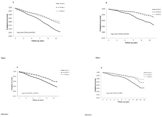 Kaplan-Meier survival (all-cause (A) and cardiovascular (B) mortality) curves according to the tertiles of a composite score of cognitive function for men and women.