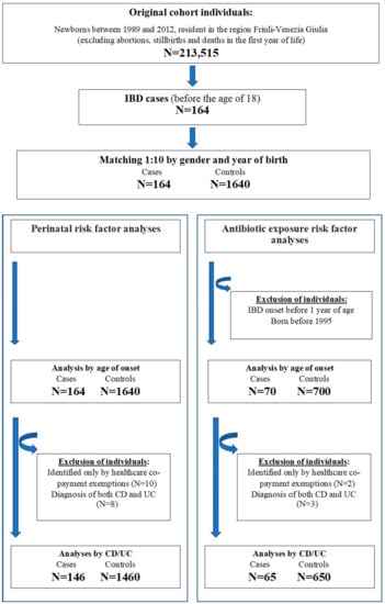 Our study aims to quantify the impact of perinatal conditions and antibiotic exposure in the first 6 and 12 months of life, on the risk of developing EO-IBD (<10 years), P-IBD (10–17 years), Crohn’s disease and ulcerative colitis, in a cohort of newborns in the Region of Friuli-Venezia Giulia (Italy).