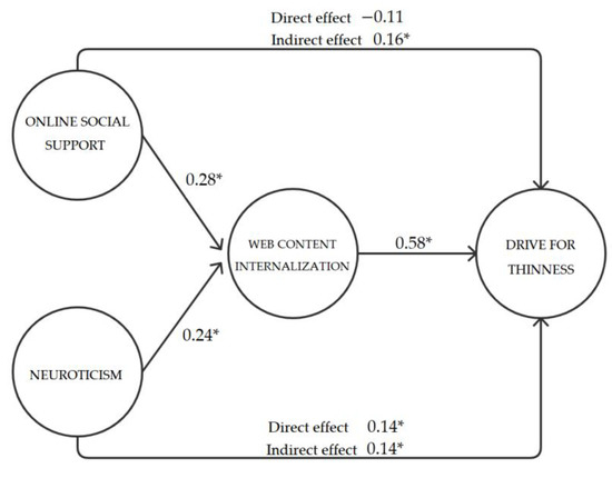 Perceived online social support from health-oriented websites predicted web content internalization (β = 0.28, p < 0.001). Perceived online social support did not have a strong direct effect on the drive for thinness, though the effect was weak and marginally significant (β = −0.11, p = 0.06; CI = −0.61; 0.01). Moreover, we found a significant indirect effect for online social support on the drive for thinness via web content internalization (β = 0.16, p = 0.001).