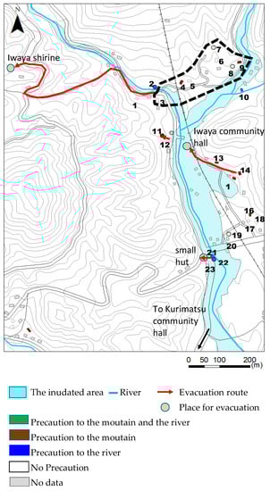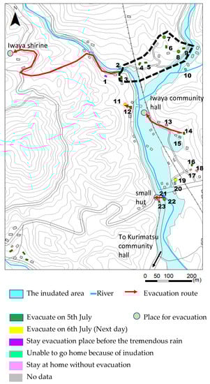 | 6 | Good | Home | 15:00–15:30: Heard the roar of the river and witnessed splashes 15:30: Telephone not working | She decided to evacuate after talking with neighbors. She evacuated to a higher place across the river with neighbors by car. | Talking with neighbors |