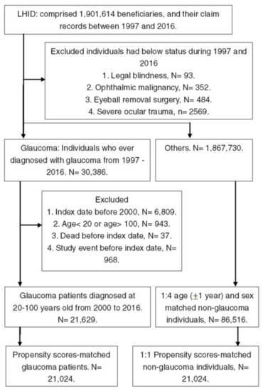 The patients in LHID were regarded as developing glaucoma (i.e., the inclusion criteria) if their medical data indicated: (1) the receipt of a diagnosis of glaucoma according to the ICD-9/ICD-10 codes; (2) the diagnosis of glaucoma was made by an ophthalmologist; (3) the receipt of an optical coherence tomography exam or visual field test before the glaucoma diagnosis; and (4) an age from 20 to 100 years. The index date was set as two years after the date of glaucoma diagnosis to strength the correlation between exposure and outcome. On the other hand, the subsequent exclusion criteria were employed for the whole study population to erase certain factors that would influence the analysis prominently: (1) the diagnosis of legal blindness before the index date; (2) the diagnosis of ophthalmic malignancy before the index date; (3) the receipt of eyeball removal surgery before the index date; and (4) the diagnosis of severe ocular trauma before the index date. Then, the patients in the study group would be further excluded if any of the following factors existed: (1) index date before 2005; (2) age less than 20 or more than 100 years; (3) death before the index date; and (4) the occurrences of outcome (demonstrated in the following section) before the index date. After that, each patient in the study group was propensity score-matched with another non-glaucoma patient considering the demographic data, socioeconomical status and co-morbidities, the latter of which were collectively defined as the control group. For the subgroup analysis, subjects in the study group were divided into those who diagnosed as open angle glaucoma (OAG), normal tension glaucoma (NTG) and angle closure glaucoma (ACG). The study group was further categorized into; (1) those that received less than two types of medical treatment within two years after the date of glaucoma diagnosis; (2) those that received more than two types of medical treatment within two years after the date of glaucoma diagnosis; (3) those that received the drainage surgery, including trabeculectomy and drainage device implant, within two years after the date of glaucoma diagnosis; and (4) those that received destructive surgery, including cyclocoagulation and cryotherapy, within two years after the date of glaucoma diagnosis. All these subgroups in the study group were compared to the control group regarding the development of dementia in the analysis model.