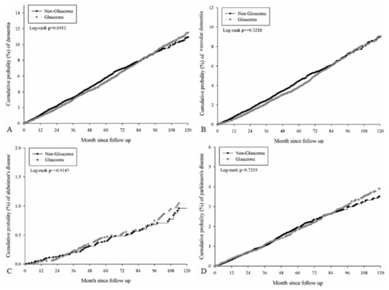 In the subgroup analysis of the current study, no significant difference is found about the rate of dementia in different subtypes of glaucoma compared to propensity score-matching subjects without glaucoma. The mechanisms of the three subtypes of glaucoma included in the current study are different; the ACG is caused by the acute elevation of intraocular pressure, while the OAG and the NTG are resulted from long-term ocular hypertensive status and possible low-perfusion condition [28,33,34]. That the incidence of dementia did not elevate in all subtypes of glaucoma may further indicate the different pathophysiologies of neurological degradation between the brain and retina, which is supported by the findings of the current study.