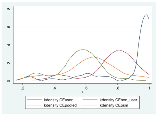 Kernel density distribution for the cost efficiency distribution. Notes: CEuser, CEnon_user, CEpooled and CEpsm represent cost efficiency distribution for users, non-users, pooled unmatched sample and for the pooled matched sample respectively.