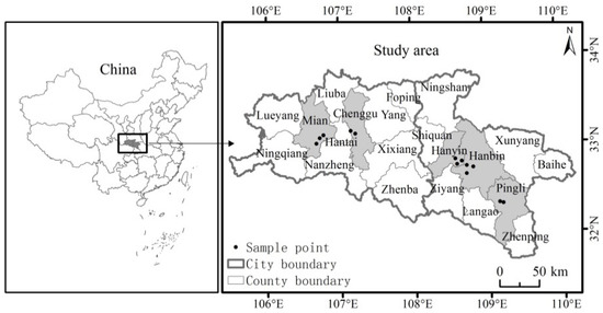 Ankang and Hanzhong cities in the Shaanxi Province of China are selected as the research areas (Figure 1). Shaanxi Province is located in central China and the upper reaches of the Yangtze River. It is a major agricultural province in China. Ankang and Hanzhong cities are situated in the southern part of Shaanxi Province. The main crops of these cities are rice, rapeseed, wheat, and maize, and the grain crops are double-cropped. These two cities are rich in natural resources and play a key role in the construction of the ecological civilization in China. China has chosen Ankang City as the pilot demonstration city for the construction of national main functional areas and the National Forest City, while Hanzhong City has been recognized as the National Historic and Cultural City, the National Ecological Construction Demonstration City, and the National Garden City. With respect to the demographics and agricultural statistics, in 2016, the total population of Ankang City stood at 264,000; the traditionally cultivated land area accounted for 197,300 ha; and the total agricultural output value was 6.09 billion yuan. During the same period, the total population of Hanzhong City was 343,000; the area of traditionally cultivated land was 205,150 ha; and the total agricultural output value was 11.86 billion yuan. As for the nonpoint pollution sources in the cities, Ankang City experiences an annual runoff of 10.7 billion m3, with 73 rivers having a catchment area of more than 100 km2. In Hanzhong City, the mainstream of the Hanjiang River is 277.8 km, which accounts for 18.1% of the total length of the Hanjiang River; the basin area of this mainstream is 19,692 km2, which accounts for 72.3% of the total land area (27,246 km2) of Hanzhong City.