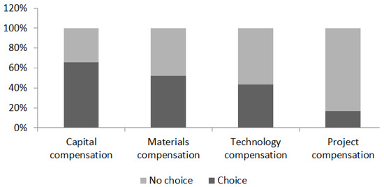 In terms of individual ecological compensation, of the 632 sample farmers, 414 (66%), 331 (52%), 273 (43%), and 108 (17%) farmers chose capital, material, technology and project compensation, respectively. The specific statistical results are shown in Figure 2.