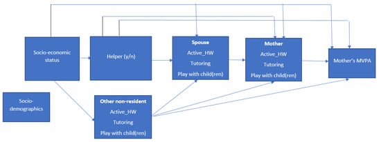 Conceptual model of socioeconomic status, household composition, activities, and their associations with the mother’s moderate to vigorous physical activity (MVPA).