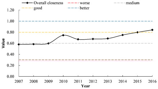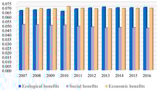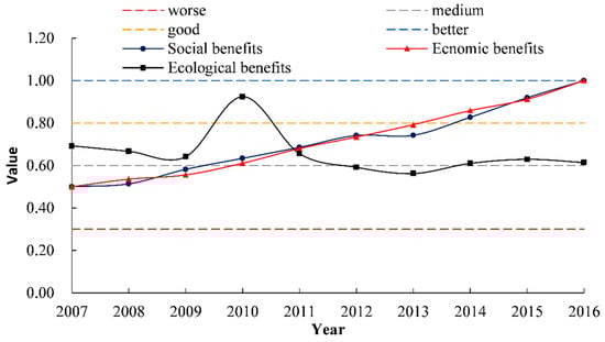 - The performance evaluation results of the target layers show that the performance levels of the economic and social benefits had risen year by year, which changed from a medium (2007–2009) to a good (2010–2014) to an excellent level (2015–2016), basically consistent with the overall performance. Although general trends in the growth of both the above two benefits are basically the same, there are also some differences. And the performance level of the ecological benefits stayed at a good level but reached an excellent level in 2010.