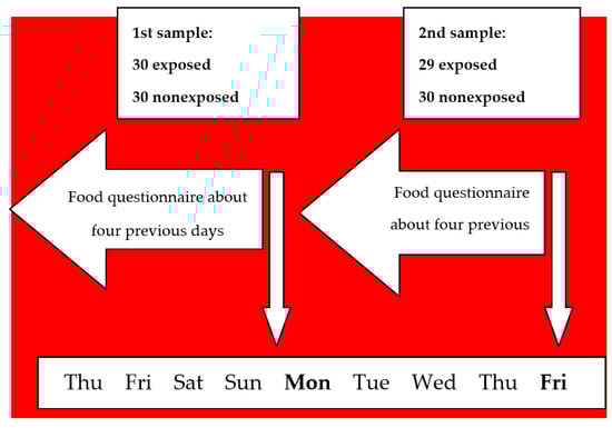 Blood and urine samples were collected on the Monday morning to have one sample after about 64 h of washing-out, i.e., from the end of the workday on Friday to Monday morning, and again on the following Friday morning to have one sample at the end of the working week with the maximum exposure to mill dust. Thus, 120 samples were planned: 30 exposed and 30 non-exposed samples collected in both groups on Monday and Friday. The questionnaires collecting the data on food consumption in the preceding four days were administered at the moment blood and urine samples were taken (Figure 1).