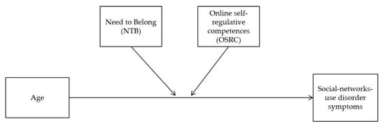 Based on the aforementioned studies and theoretical assumptions, we argue that there is strong need for investigating not only possible factors in isolation, but especially their interactions in order to better understand the development and maintenance of a problematic social-networks-use. This appears particularly important in order to support prevention and intervention measures especially for young individuals. We hypothesize that the effect of need to belong on symptoms of a social-networks-use disorder is moderated by the ability to self-regulate one’s own online behavior. However, when keeping in mind that the online behavior of children and adolescents is notably changing during childhood and adolescence [], the interaction effects have to be controlled for a possible age effect. This means that we include age as first predictor to investigate the effect age may have on symptoms of a social-networks-use disorder. We then include need to belong and online self-regulative competences to examine their incremental validity beyond age. Overall, we aim at gaining deeper insights into the protective power of online self-regulative competences by focusing on individuals at risk due to their age and specific needs. Our hypothesized model is depicted in Figure 1.