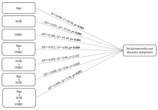 Hypothesized moderated regression model with age, need to belong (NTB), and online self-regulative competences (OSRC) as (moderating) predictors for a social-networks-use disorder.
