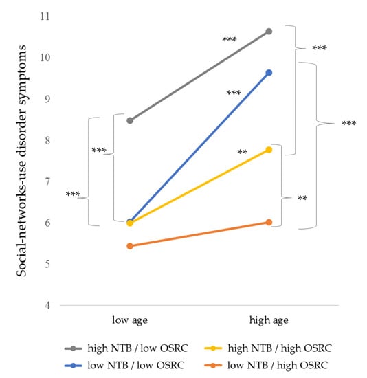 Simple Slopes visualizing the significant three-way interaction between age, need to belong (NTB), and online self-regulative competences (OSRC) in the prediction of social-networks-use disorder symptoms with ** p < 0.01, *** p < 0.001 and for all significant t: 2.65 ≤ t ≤ 6.78.