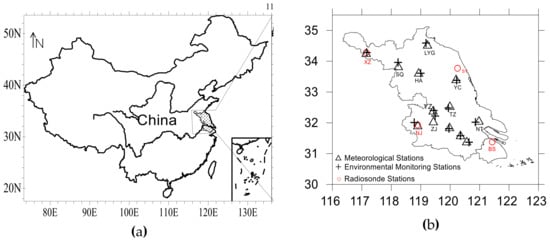 (a) The geographical location of Jiangsu province, China (UTC/GMT+08:00); (b) The distribution of 13 meteorological, 13 environmental monitoring and 4 radiosonde stations. (Lianyungang: in short LYG; Xuzhou: XZ; Nanjing: NJ; Nantong: NT; Suqian: SQ; Zhenjiang: ZJ; Taizhou: TZ; Huaian: HA; Yancheng: YC; Changzhou: CZ; Suzhou: SZ; Yangzhou: YZ; Baoshan: BS; Sheyang: SY).