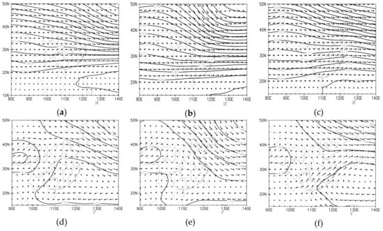 Upper and lower altitudes under three synoptic flow patterns were described as follows. At 500 hPa, the northwest westerly wind prevailed under EQP; the northwest wind prevailed under ACF; the straight west wind prevailed under INT. That is, in the meridional direction: ACF >EQP>INT (Figure 2a–c). At 850hPa, the west wind prevailed under EQP; the northwest wind prevailed under ACF; the southwest wind prevailed under INT (Figure 2d–f). In the sea-level-pressure field, Jiangsu was on the rear of the high pressure moving towards the sea under EQP; under ACF, Jiangsu was in the wedge at the front of cold high; under INT, Jiangsu was in the uniform pressure field at the front of low pressure. All the wind speeds were very low, and wind directions varied in different regions (Figure 2g–i).