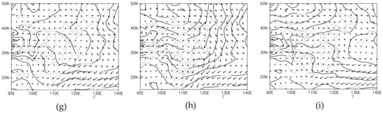 The synoptic situation for each type: equalized pressure (EQP: (a,d,g)), advancing edge of a cold front (ACF: (b,e,h)), inverted trough of low pressure (INT: (c,f,i)); 500 hPa (a–c), 850 hPa (d–f) and SLP (g–i). Among them, contours were pressure field (unit: hPa) and vectors were wind field (unit: m s−1).