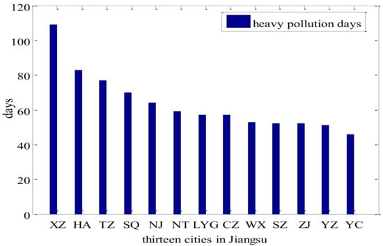 Statistical characteristics were obtained by the data from 2013 to 2017 and verified by the data of 2018. PM2.5 HPDs in 13 prefecture-level cities of Jiangsu from 2013 to 2017 were shown in Figure 3. The largest number of PM2.5 HPDs appeared in Xuzhou (109 days), followed by Huaian (83 days), Taizhou (77 days), Suqian(70 days), Nanjing (64 days), Nantong (59 days), Lianyungang (57 days), Changzhou (57 days), Wuxi (53 days), Suzhou (52 days) and Zhenjiang (51 days); the number in Yancheng was the minimum (46 days).