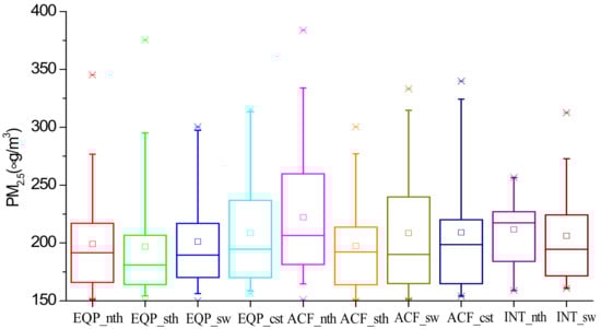 PM2.5 concentration distributions of RPHPDs under the ten types. Rectangle: 25%–75% (quartile); rectangle midline: the median; end of the line: 5%–95%; ×: 1% and 99%; □: average. (equalized pressure (EQP), advancing edge of a cold front (ACF) and inverted trough of low pressure (INT).EQP in North Jiangsu (EQP_nth), EQP in South Jiangsu (EQP_sth), EQP in Southwest Jiangsu (EQP_sw), EQP in Coastal Jiangsu (EQP_cst), ACF in North Jiangsu (ACF _nth), ACF in South Jiangsu (ACF _sth), ACF in Southwest Jiangsu (ACF _sw), ACF in Coastal Jiangsu (ACF _cst), INT in North Jiangsu (INT_nth) and INT in Southwest Jiangsu (INT_sw)).