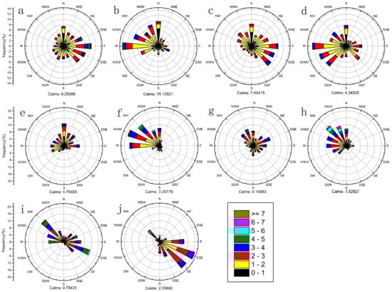 The prevailing wind direction was different under ten different types (Figure 5). The prevailing wind in EQP_nth was the southeast direction (Figure 5a), the northwest direction in EQP_sth (Figure 5b), the southeast direction in EQP_sw and the southwest direction in EQP_cst, both followed by north direction (Figure 5c,d). In ACF_nth, the most frequent wind direction was north (Figure 5e). For ACF_sth, the direction was northwest (Figure 5f). In ACF_sw, the predominant wind direction was northwest, followed by northeast direction (Figure 5g). In ACF_cst, the wind was northwest (Figure 5h). In INT_nth, the most frequent wind direction was northwest and southeast (Figure 5i). Southeast wind prevails in INT_sw (Figure 5j). Overall, wind directions under EQP in different regions were more dispersed, whereas, under ACF and INT, they were more concentrated. Wind speed under EQP was mostly below 3 m/s. Wind speed under ACF and INT were larger, mainly distributed in 0–5 m/s and 2–5 m/s, respectively.