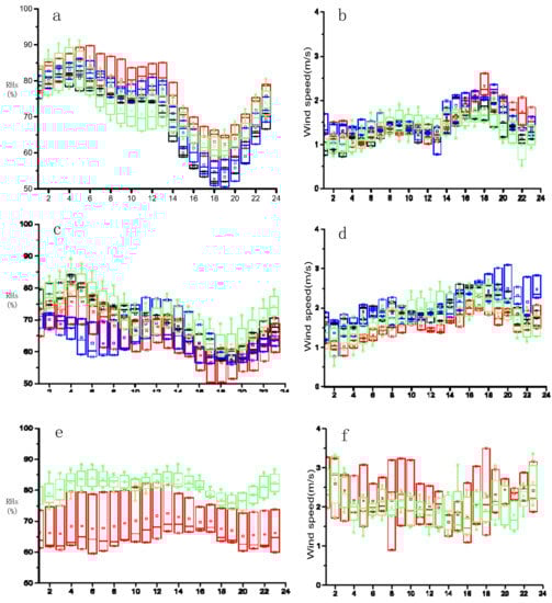 Diurnal variations of wind speed and RHs for EQP(a,b), ACF(c,d) and INT(e,f); red: North Jiangsu, black: South Jiangsu, green: Southwest Jiangsu, blue: Coastal Jiangsu, X-axis was time (unit: h); Rectangle: 25%-75% (quartile); rectangle midline: the median; end of the line: 5%-95%; ×: 1% and 99%; □: average. (equalized pressure (EQP), advancing edge of a cold front (ACF) and inverted trough of low pressure (INT)).