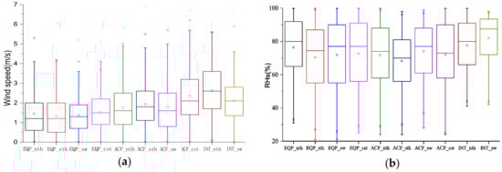 In this section, the threshold values of wind speed and RHs on RPHPDs were investigated. First, time points of RPHPDs were selected. Then average, maximum and minimum values of wind speed and RHs were calculated. Finally, the threshold values of wind speed and RHs were counted in terms of 25–75% high probability range when RPHPDs occurred. The results were shown in Figure 7. It can be seen from Figure 7a that wind speeds in ten types were very low, with an average of 1.3–2.6 m s−1. Wind speeds can reached more than 5 m s−1 at some time points in all ten types. In terms of 25%–75% high-value range of RPHPDs, the wind speed varied within 0.5–3.6 m s−1. The result was in good agreement with the conclusion of Dai et al. []. Specifically, the maximum wind speed was observed in INT_nth, followed by ACF_cst and INT_sw. Wind speeds in INT_nth were mainly within 1.5–3.5 m s−1 and the maximum value reaches 7.5 m s−1. Average wind speeds in INT_nth, INT_sw and ACF_cst were all above 2 m s−1.