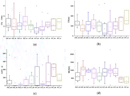 Specifically, the average ITI in EQP_cst was the strongest and that in ACF_sth was the weakest (Figure 8a). Under EQP and ACF, ITI was the strongest in Coastal Jiangsu, and the weakest in Southwest Jiangsu. However, under INT, ITI in Southwest Jiangsu was slightly higher than that in North Jiangsu. For the same region, the average ITI under ACF was lower than that under EQP and INT, and the average ITK under ACF was lower than that under the other two patterns (Figure 8b). Under EQP and ACF, the largest ITK was in North Jiangsu, followed by Coastal Jiangsu, Southwest Jiangsu and South Jiangsu in turn. Under INT, ITK was larger in Southwest Jiangsu than that in North Jiangsu. Only in ACF_sth, ACF_cst and INT_nth, LHTI on a few RPHPDs was relatively higher. LHTI in other types were all below 300 m in terms of 25%–75% high probability range (Figure 8c).