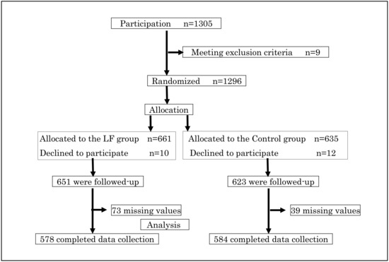 This figure is the study profile. Children wishing to participate were 1305, and 9 children were excluded, and 1296 children were randomized into the LF group or the control group. Finally, 578 LF of the group and 584 of the control group were statistically analyzed.