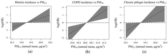 Exposure-response functions: (a) PM2.5 vs. rhinitis incidence; (b) PM10 vs. COPD incidence; (c) PM2.5 vs. of chronic phlegm incidence. The log-ORs were calculated assuming the median annual concentrations of PM as the reference (30.1 µg/m3 for PM10 and 19.3 µg/m3 for PM2.5).
