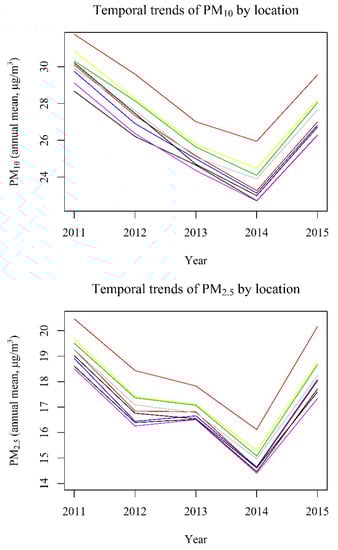 The annual average exposure levels were calculated for the year 2011, i.e., only at the time of the second survey, since this is the first year with available estimates for both PM10 and PM2.5. For the latter, in fact, the monitoring systems were installed quite recently in Italy. Despite the average PM10 concentrations decreased over the period 1991–2011 (from about 50 μg/m3 to 25 μg/m3), we hypothesized that the relative differences (spatial contrasts) in the average PM exposure levels among the locations (residential addresses) remained approximately constant. Indeed, we represented the observed temporal trends for the annual mean concentrations of PM from 2011 to 2015, in 10 randomly selected residential locations (Figure 3), and observed that the vertical differences among the curves remained approximately constant over the years. The aforementioned hypothesis is reinforced by several previous studies. As reported by Hoek, the spatial stability of air pollution contrasts is a necessary assumption for application of recently developed models for long-term exposure []. The same author observed that, for traffic-related pollutants including PM, spatial stability can be expected []. Moreover, the assumption that within-city spatial patterns remain constant over the years, also when mean concentrations of air pollutants change over time, has been made within the European Study of Cohorts for Air Pollution Effects (ESCAPE) []. Similar between-city spatial patterns were also observed in the Study on Air Pollution and Respiratory Diseases in Adults (SAPALDIA) [] and in the Harvard Six Cities [] cohorts. Even in the European Community Respiratory Health Survey (ECRHS), the authors used air pollution estimates only at the time of the second survey in order to assess relationship with the incidence of respiratory outcomes [].