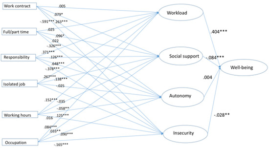 The results highlight that the type of occupation, as well as responsibility over subordinates, were more strongly related with the latent variables, followed by working hours and type of contract. On the other hand, part-time work, as well as isolated work, showed the lowest contribution to the model. Regarding the four latent factors, there was a strong and statistically significant relationship in the case of “workload” and “social support” with well-being (with positive and negative association values, respectively). “Job insecurity” had a positive and significant association with well-being, whereas “autonomy” did not reach statistical significance.